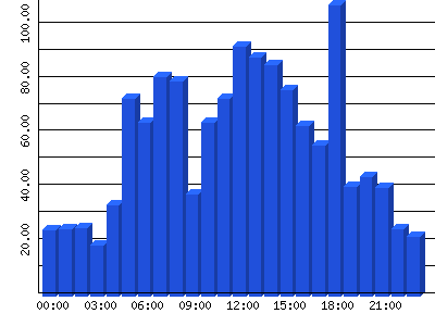 | Stunden | Zugriffe | % | Bytes | % | Bits/Sek | Bytes/Sek |
